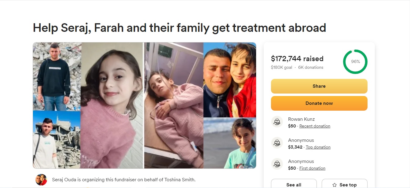 I am Toshina Smith, an American activist from the USA. I manage and send the money received from fundraising for Seraj, Farah and their family. Seraj suffers from many diseases and poisoning as a result of what the occupation did to him when he was tortured, abducted and unlawfully arrested through displacement. Farah suffers from a chronic disease, and as a result of the war it has caused multiple complications. Life threatening complications. Seraj has not talked about his sister Farah’s illness to the public in order to preserve the psychological state of his sister, Farah and his family along with his parents personal wishes for privacy. Honestly Farah is dying slowly and Seraj, their parents and the rest of the family are all going through a very difficult situation. In addition to Farah and Seraj suffering from disease and illness Seraj’s father also suffers from heart disease. Which as you can imagine is only worse with the mweight of the world on his shoulders trying to keep his family as safe as possible during a genocide. I ask you to help them in anyway you can, donate, share and please always pray for them. It breaks my heart a million times over. However knowing this family, loving them as my own and being “part” of their family has inspired me forever and I will always be grateful for them and for truly changing my life. This is something I have witnessed over and over again from Palestinians, who are some of the greatest teachers of grace, integrity and human kindness I have ever met. May we all strive to be like them. Please Feel free to email through GoFundMe with any questions you may have or send me a message. Thank you for your time, love and support